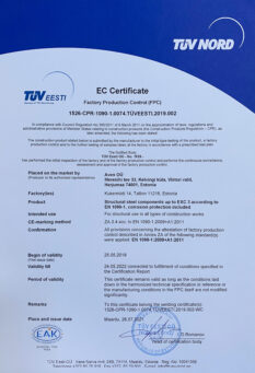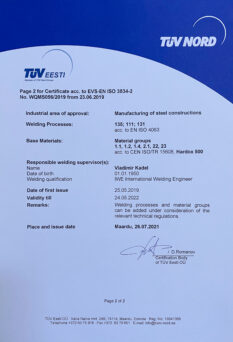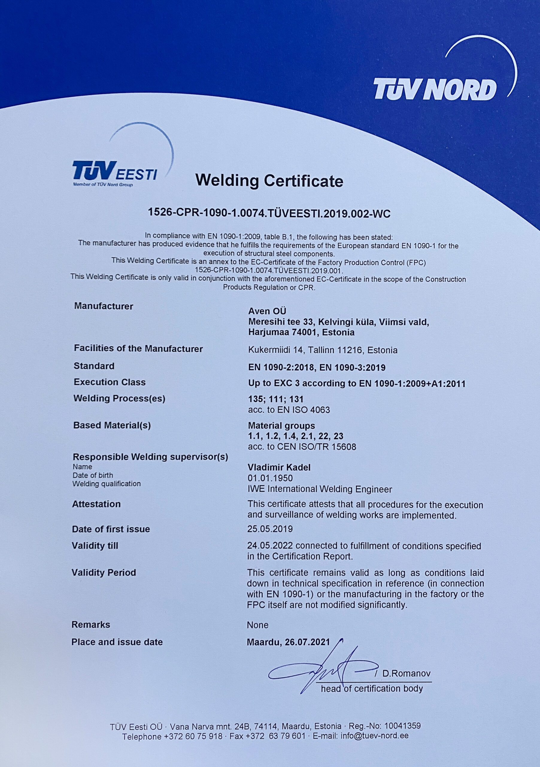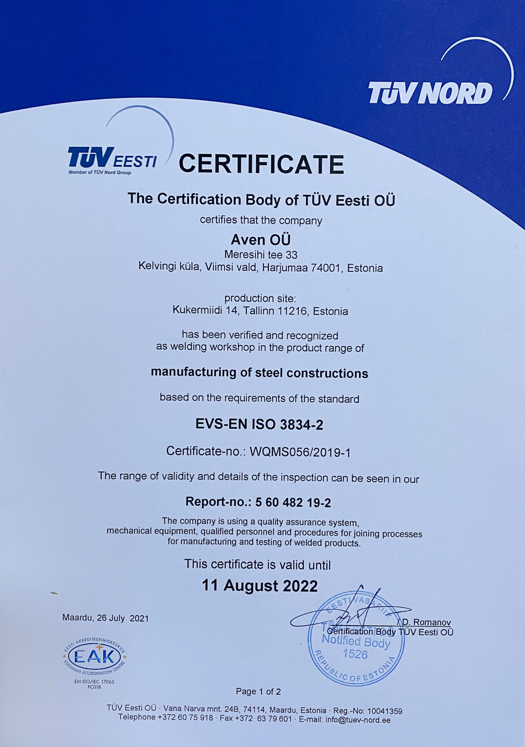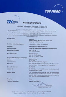 Kõik tooted ja projektid väljastatakse koos nõuetekohase dokumentatsiooniga, materjalide ja pinnakatete sertifikaatidega, toimivusdeklaratsiooni ja CE märgisega. Tootmine on sertifitseeritud ning vastab EN 1090-2:2018, EN 1090-3:2019 ning EXC3 ja 3834-2 standarditele.